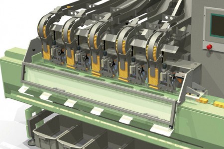 The high speed SKIPPER™ unit is an unique and innovative Houdijk pile/stack loading system for plain products. The SKIPPER™ accepts without lane reduction / expansion the given number of product lanes coming from the oven. It separates extremely gently individual products from the vertical magazine by means of a servo driven horizontal indexing disc. The individual products are transferred in the destined pitches of the infeed chain of any make flow wrapping machine. Thus it composes the product pile/stack with set count.