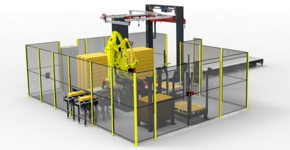Palletizing cells by means of four or six axis robots, equipped with automated systems of infeed/outfeed of pallets, as well as the insertion of separator sheets of cardboard between layers, according to the customer requirements.